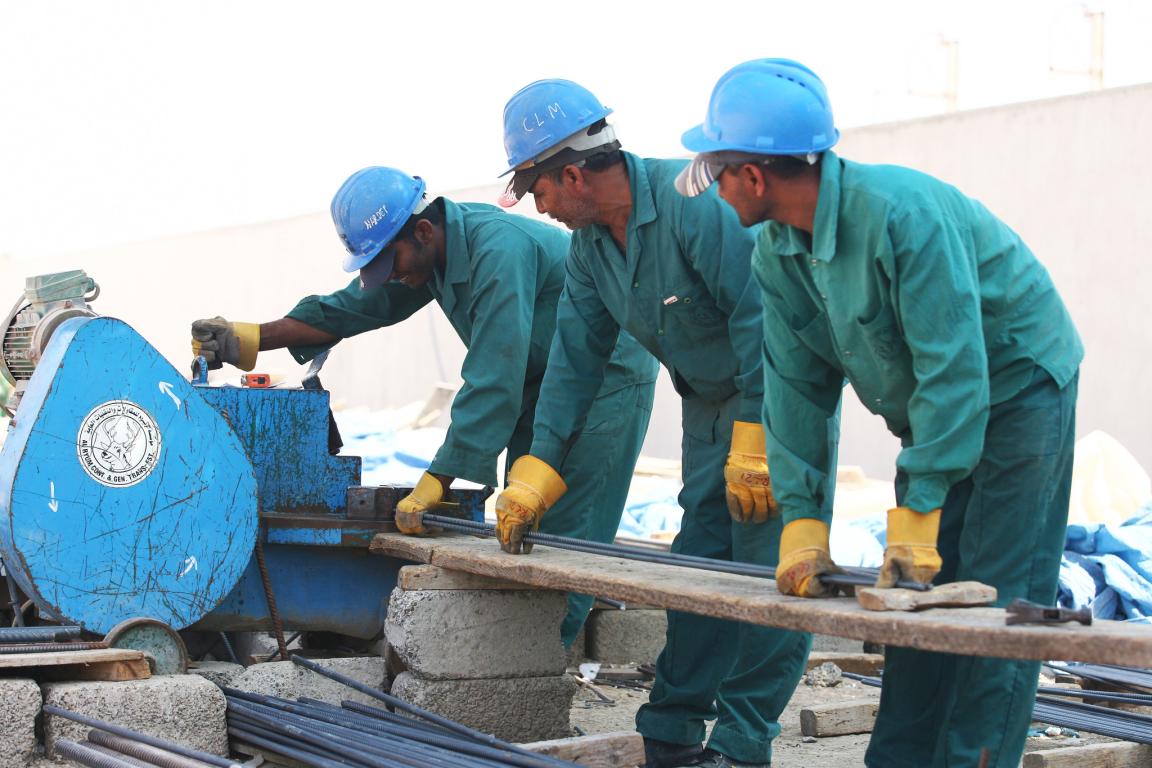 Foreign workers cut steel on a construction site
